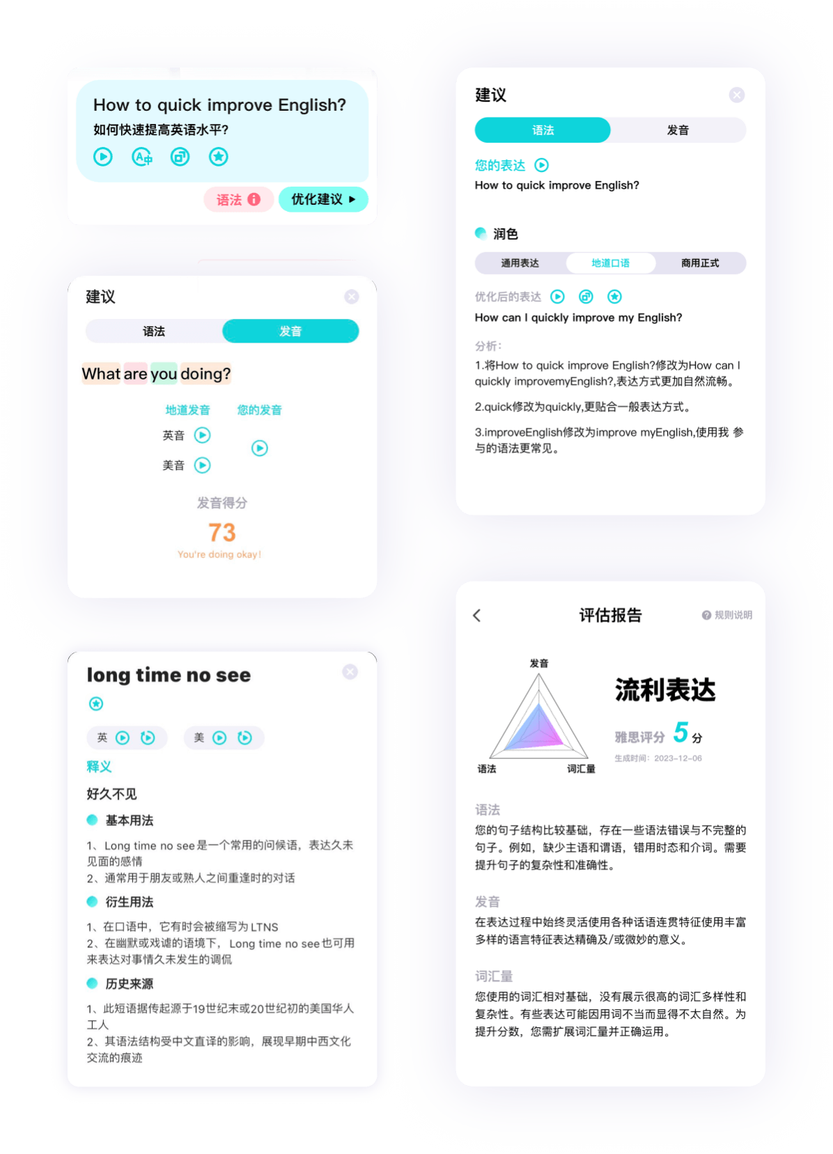 - 独创的自适应学习机制,精准学习,构建用户画像和英语水平知识图谱,背后依托智能体的能力精准控制用户需要学什么。
