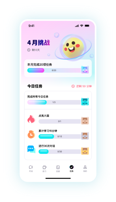 - 任务体系和游戏化设计让学习跟玩游戏一样。